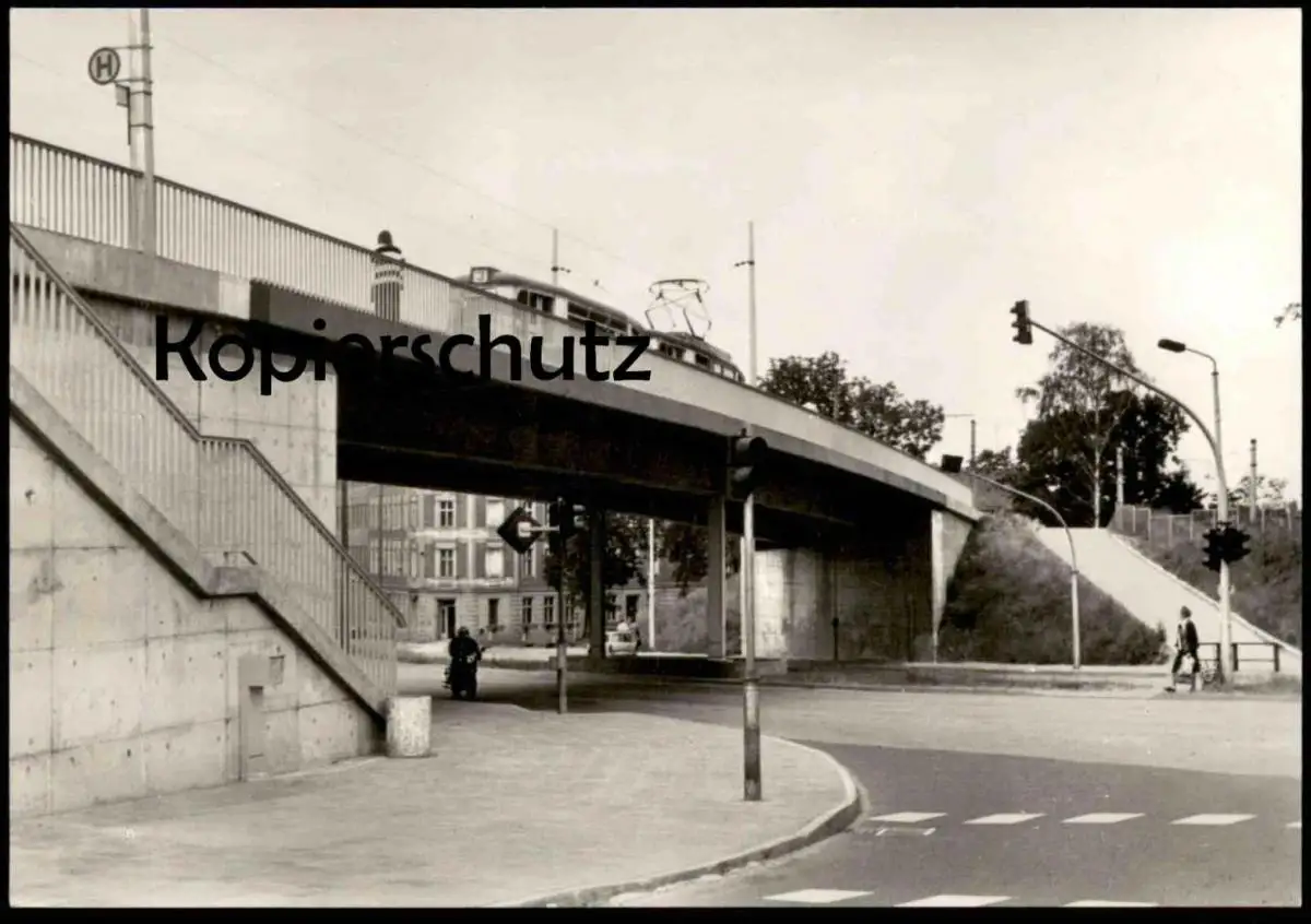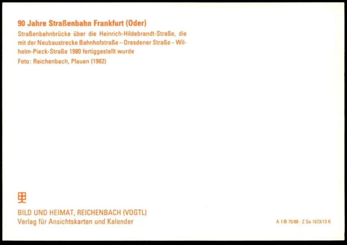 ÄLTERE POSTKARTE FRANKFURT ODER STRASSENBAHNBRÜCKE ÜBER DIE HEINRICH-HILDEBRANDT-STRASSE, DIE MIT DER NEUBAUSTRECKE BAHNHOFSTRASSE DRESDENER STRASSE WILHELM-PIECK-STRASSE FERTIGGESTELLT WURDEVerlag: Bild und Heimat, Reichenbach; Foto: Reichenbach, Plauen (1982)