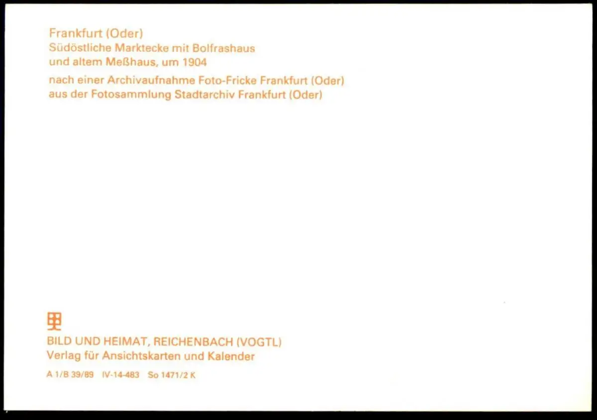 ÄLTERE POSTKARTE FRANKFURT ODER SÜDÖSTLCHE MARKTECKE UND ALTEM MESSHAUS UM 1904 NACH EINER ARCHIVAUFNAHME FOTO-FRICKE FRANKFURT (ODER) AUS DER FOTOSAMMLUNG STADTARCHIV FRANKFURT (ODER)Verlag: Bild und Heimat, Reichenbach