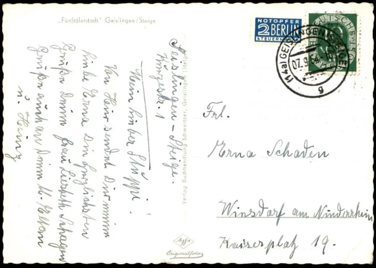 Gelaufen: 07.09.1964 mit Stempel Geislingen (Steige) nach Winsdorf am Niederrhein