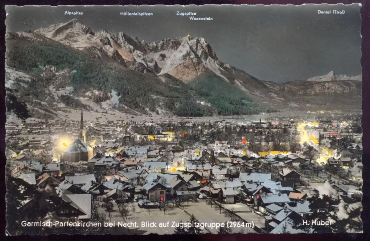 ÄLTERE POSTKARTE GARMISCH PARTENKIRCHEN BEI NACHT BLICK AUF ZUGSPITZGRUPPE