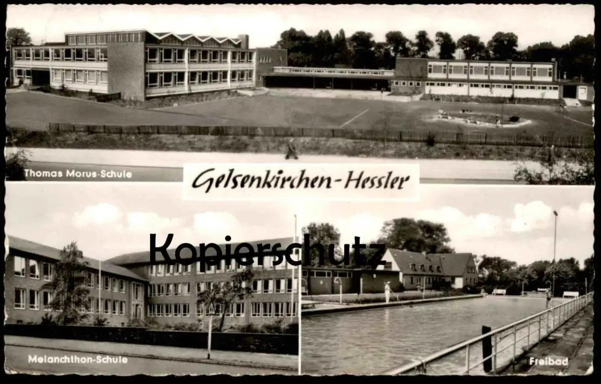 ÄLTERE POSTKARTE GELSENKIRCHEN-HESSLER THOMAS MORUS SCHULE MELANCHTHON SCHULE FREIBAD