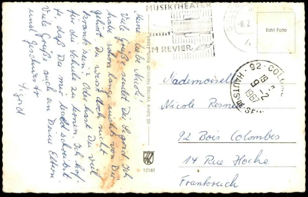Gelaufen: 08.02.1967 mit Stempel Gelsenkirchen und Maschinenwerbestempel „Musiktheater im Revier“ nach Bois Colombes, Briefmarke (sauber) abgelöst