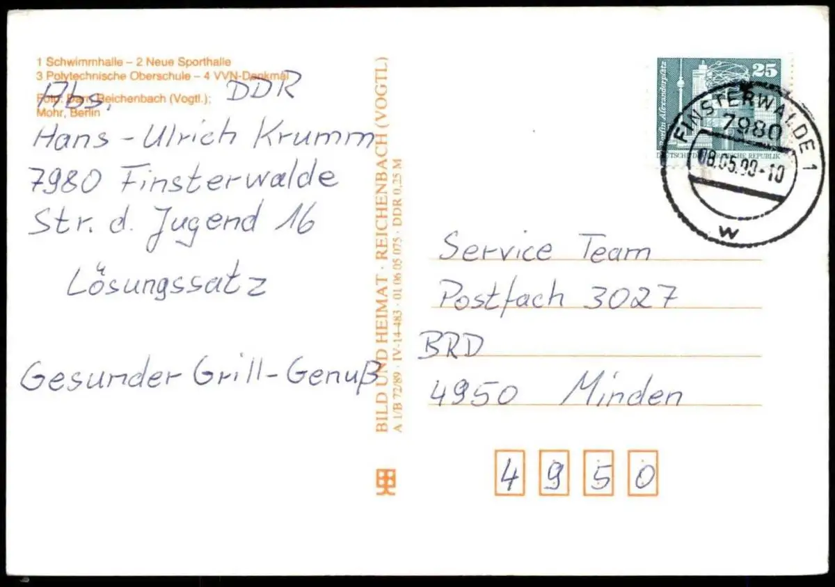 Gelaufen: 08.05.1990 mit Stempel Finsterwalde nach MindenErhaltung (s. Scan): mittel, Ecke rechts oben & links unten stärker bestoßen / 915415