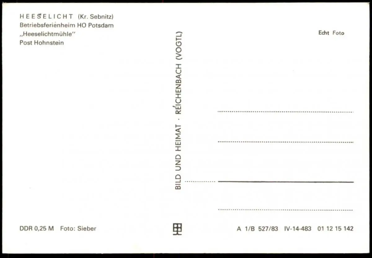 ÄLTERE POSTKARTE HEESELICHT KREIS SEBNITZ BETRIEBSFERIENHEIM HO POTSDAM HEESELICHTMÜHLE POST HOHNSTEINVerlag: Bild und Heimat, Reichenbach; Foto: Sieber