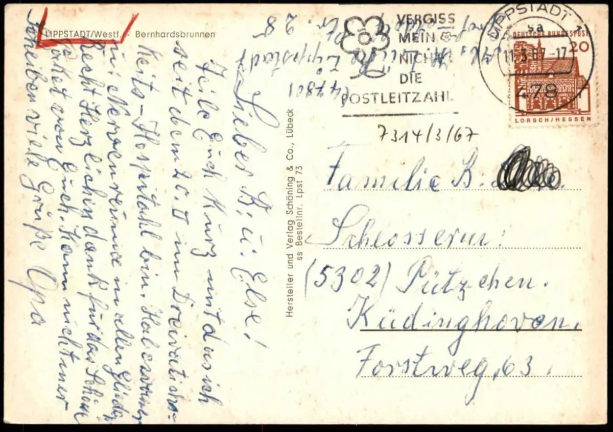 Gelaufen: 11.03.1967 mit Stempel Lippstadt nach Pützchen KüdinghovenErhaltung (s. Scan): mittel, oben rechts bestoßen / 918434