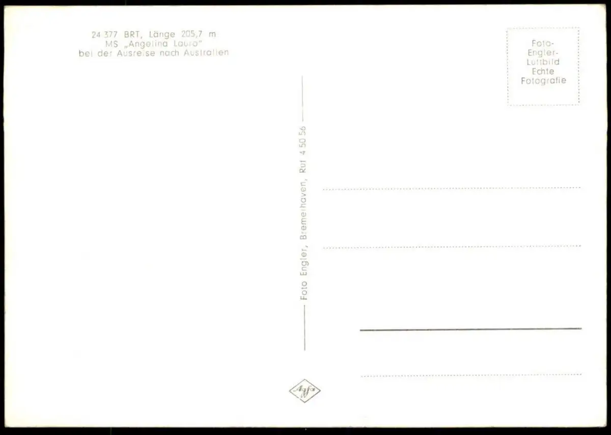 ÄLTERE POSTKARTE MS ANGELINA LAURO BEI DER AUSREISE NACH AUSTRALIENVerlag: Foto Engler, Bremerhaven