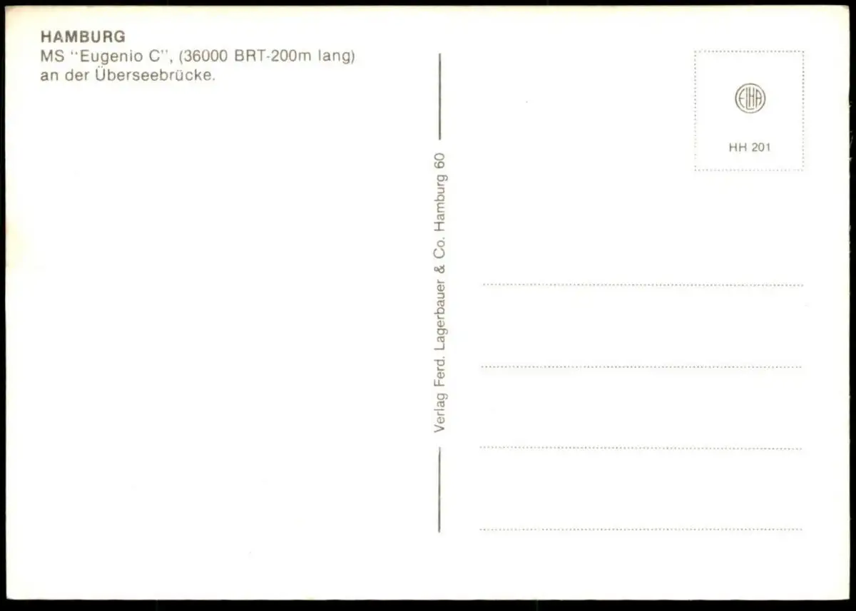 ÄLTERE POSTKARTE MS EUGENIO C COSTA KREUZFAHRTSCHIFF AN DER ÜBERSEEBRÜCKE HAMBURGVerlag: Ferd. Lagerbauer, HamburgGelaufen: neinErhaltung (s. Scan): gut / 918399