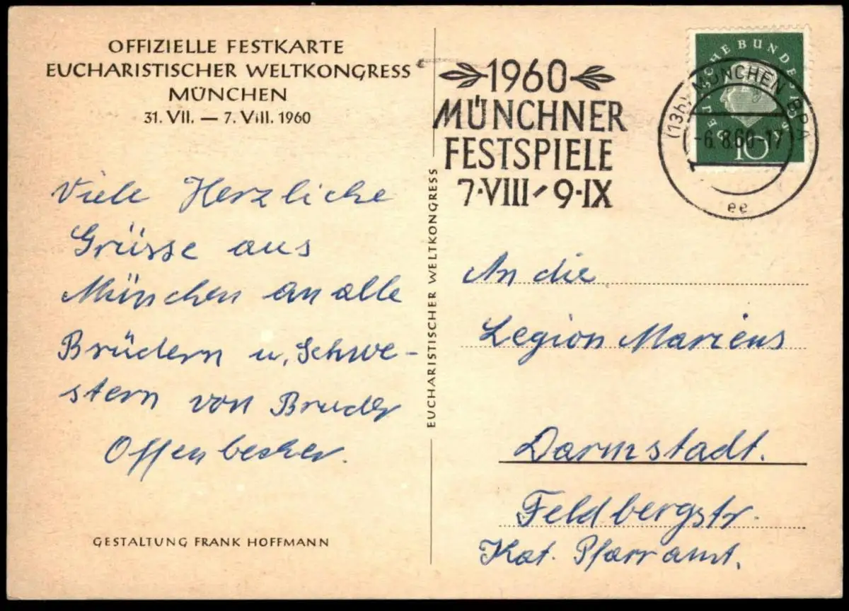 Gelaufen: 06.08.1960 mit Stempel München sowie Maschinenwerbestempel 1960 Münchner Festspiele 07.08. - 09.09. an die Legion Mariens Karlsruhe