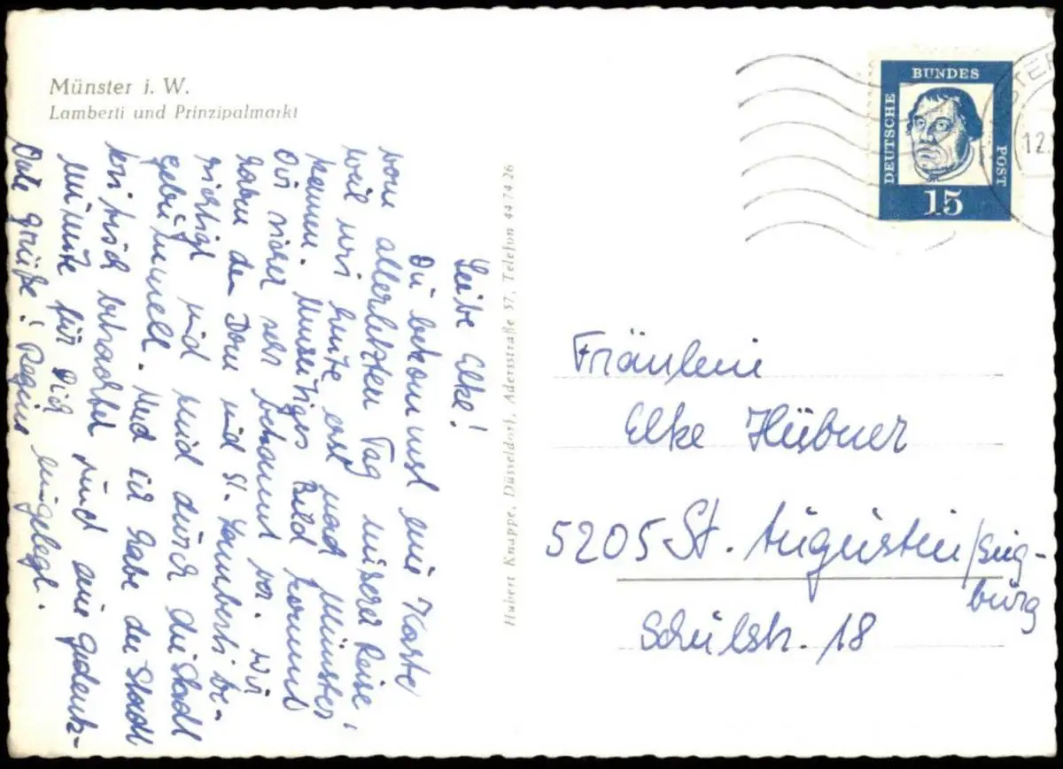Gelaufen: 12.xx.19xx mit Stempel Münster nach St. Augustin