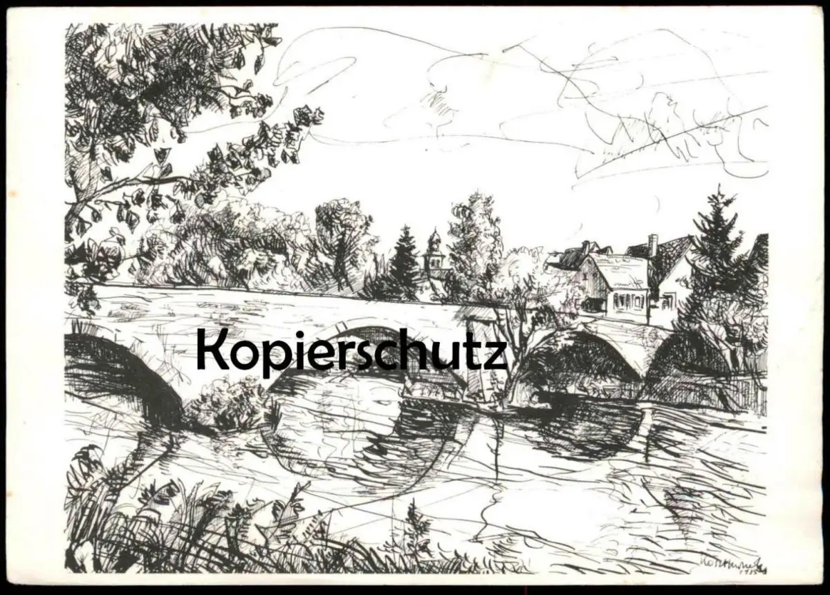 ÄLTERE POSTKARTE NEUENSTADT AM KOCHER KOCHERBRÜCKE ZWISCHEN NEUENSTADT UND KOCHERTÜRN FEDERZEICHNUNG VON MICHAEL KOSZT