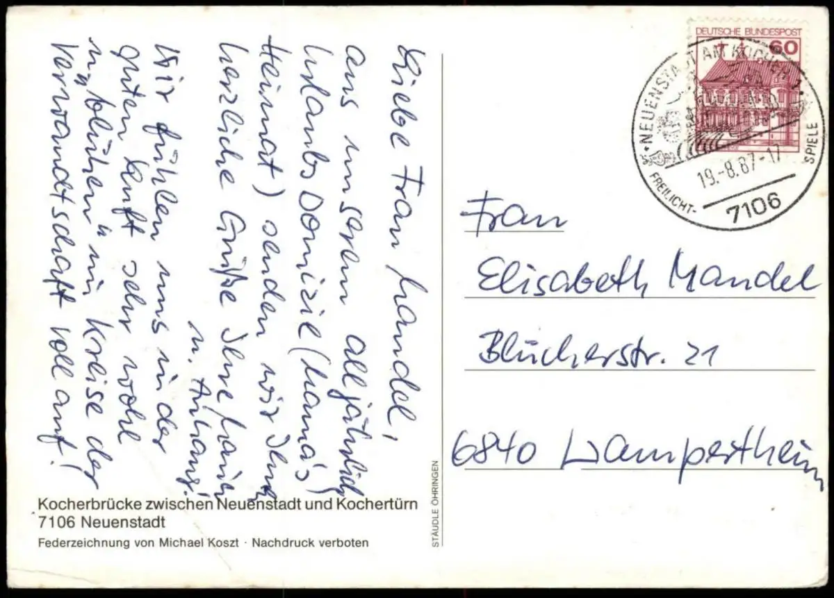 Gelaufen: 19.08.1987 mit Stempel Neuenstadt am Kocher nach Lampertheim