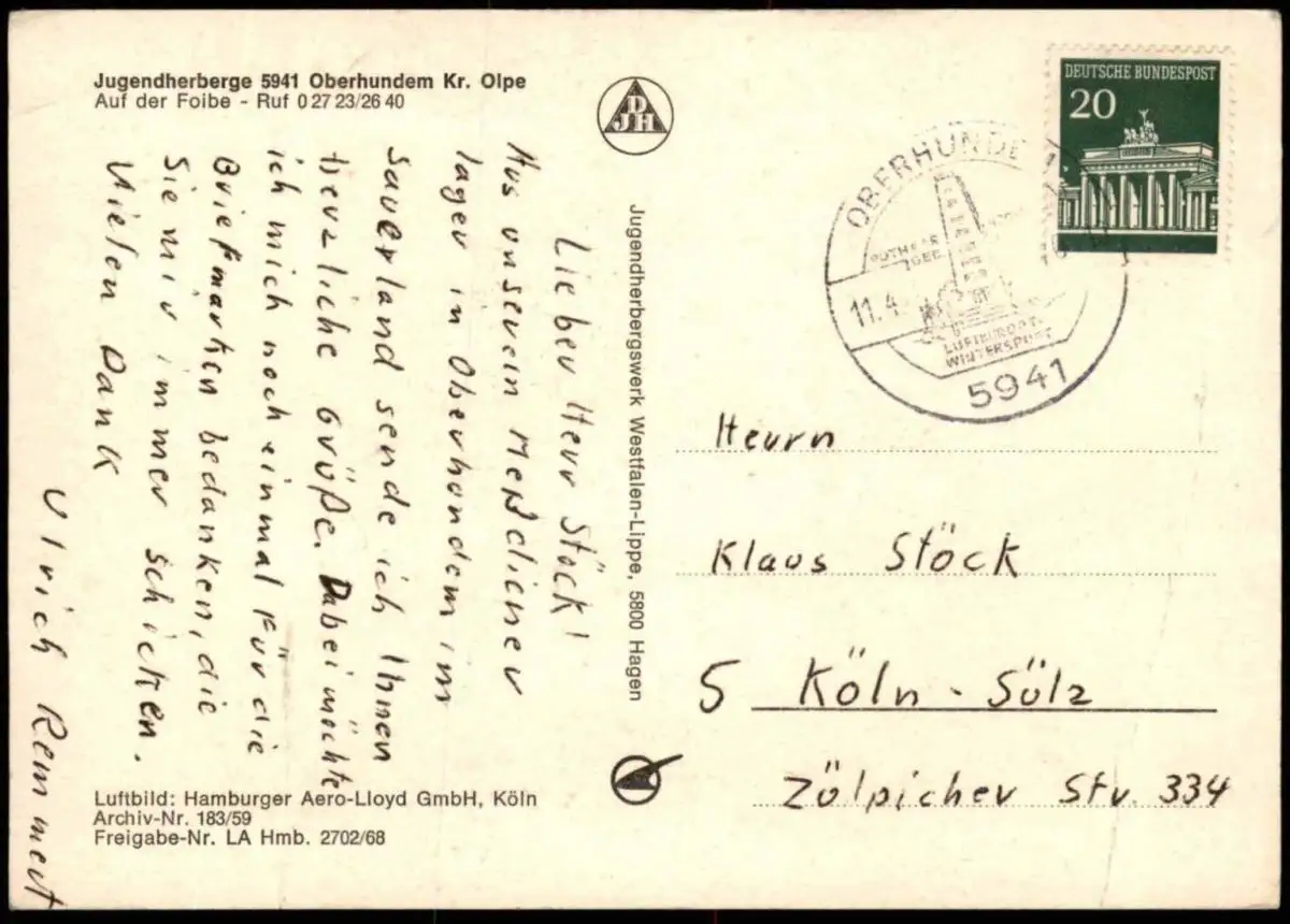 Gelaufen: 11.04.19xx mit Stempel Oberhundem nach Köln-Sülz