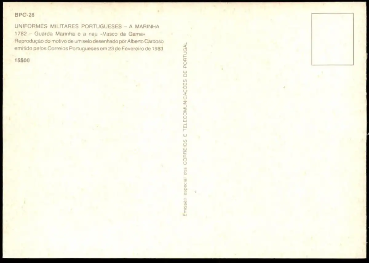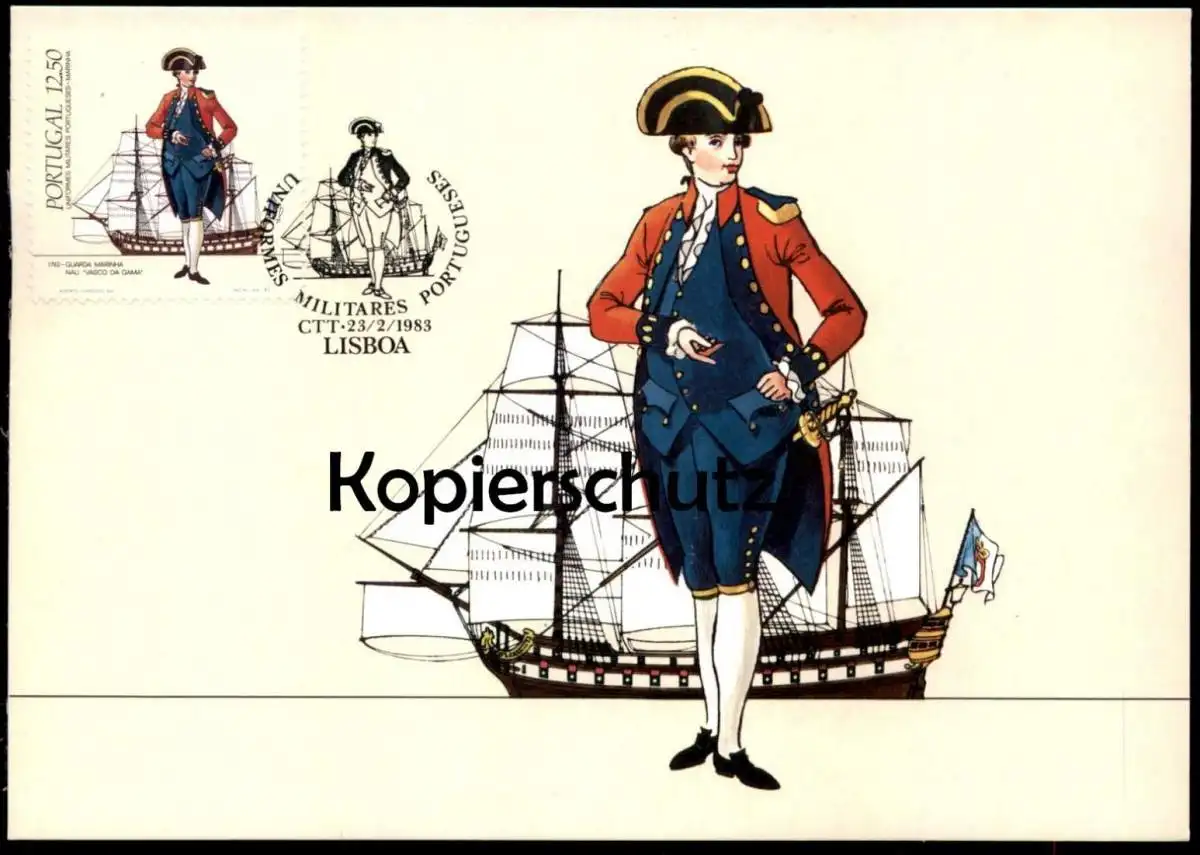 ÄLTERE POSTKARTE PORTUGAL MAXIMUMKARTE BPC-28 UNIFORMES MILITARES PORTUGUESES A MARINHA 1782 LISBOA GUARDA MARINHA E A NAU VASCO DA GAMA