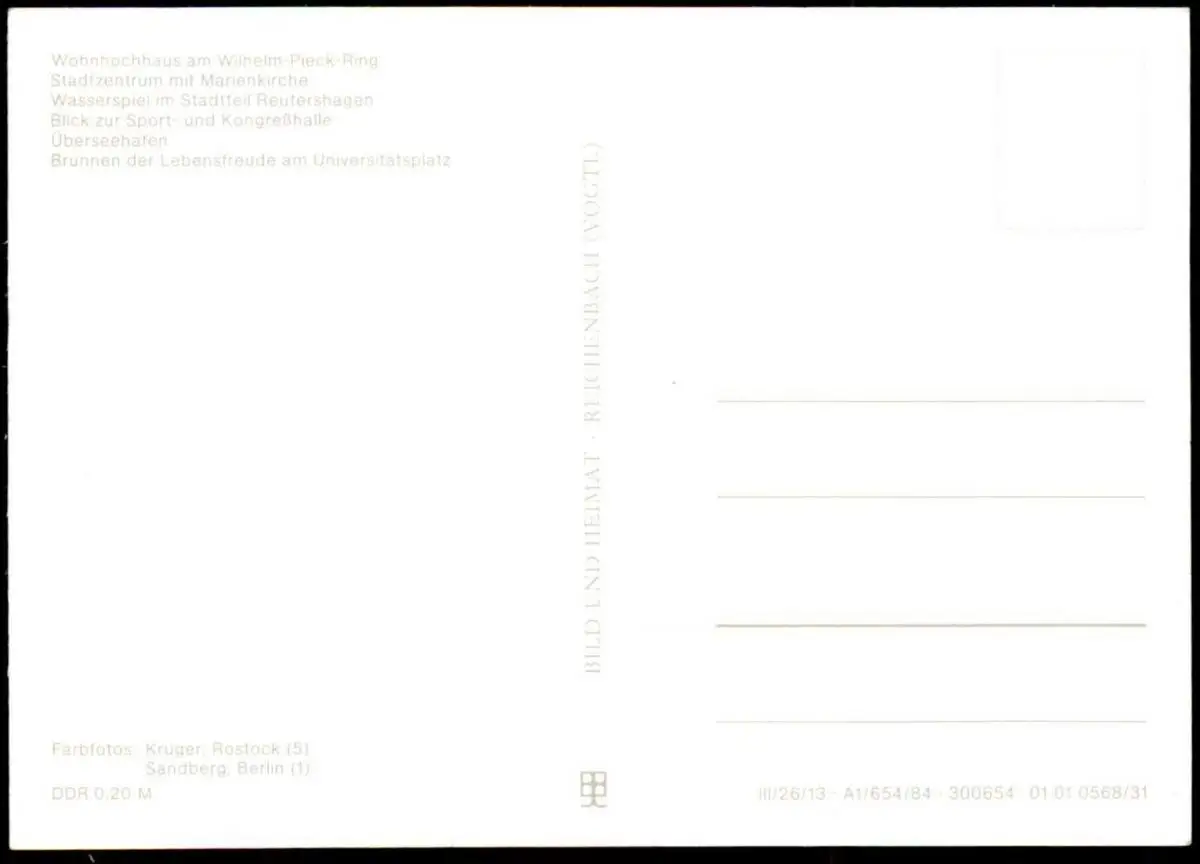 ÄLTERE POSTKARTE ROSTOCK WOHNHOCHHAUS AM WILHELM PIECK RING STADTZENTRUM MIT MARIENKIRCHE WASSERSPIEL IM STADTTEIL REUTERSHAGEN BLICK ZUR SPORT- UND KONGRESSHALLE ÜBERSEEHAFEN BRUNNEN DER LEBENSFREUDE AM UNIVERSITÄTSPLATZVerlag: Bild und Heimat, Reichenbach; Farbfotos: Krüger, Rostock; Sandberg, Berlin