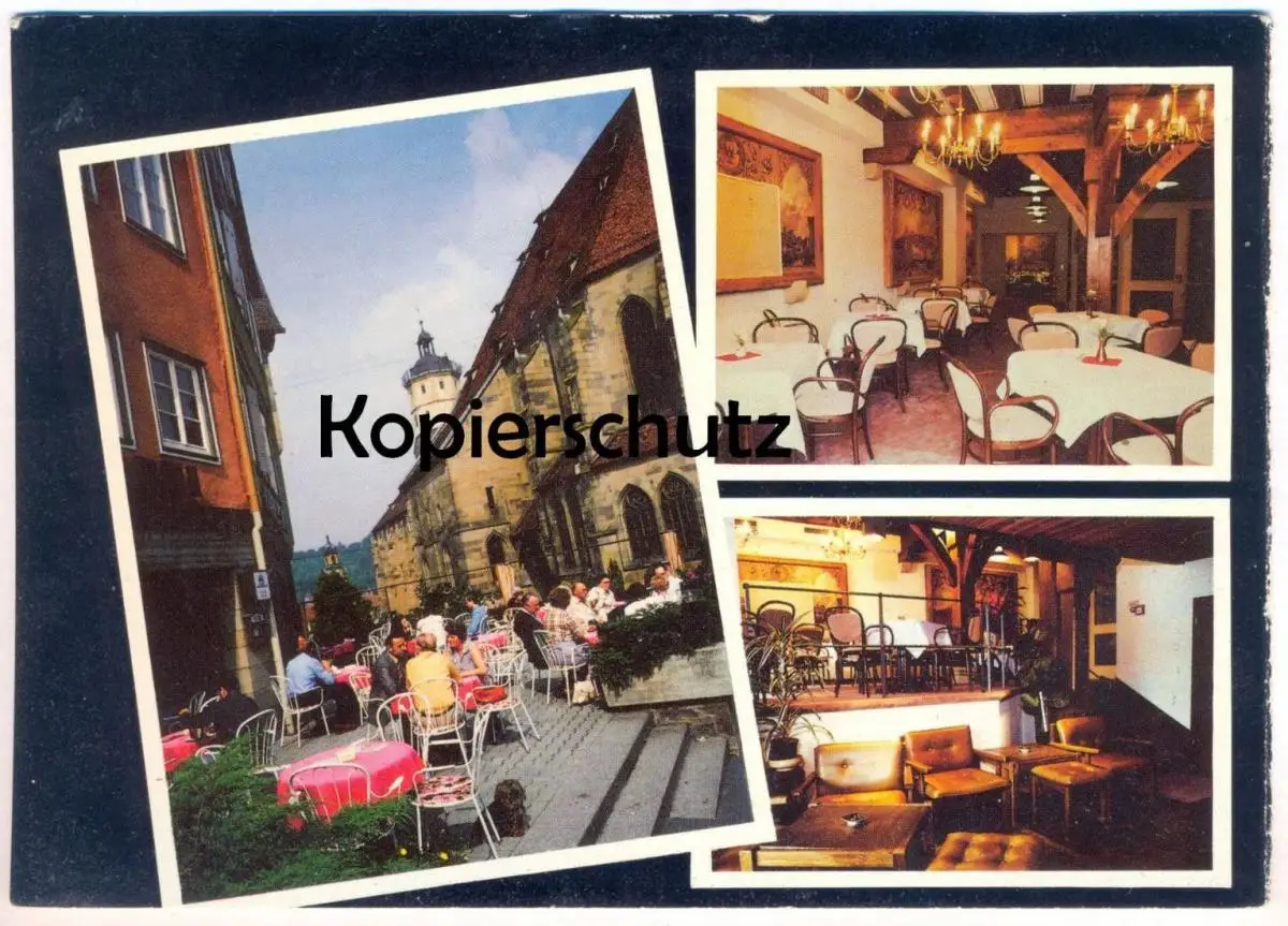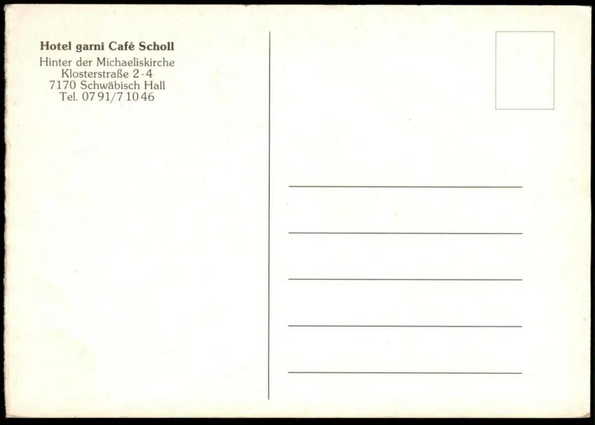 ÄLTERE POSTKARTE SCHWÄBISCH HALL CAFÉ SCHOLL HINTER DER MICHAELISKIRCHE AUSSENGASTRONOMIE INNENANSICHT AK cpa postcard