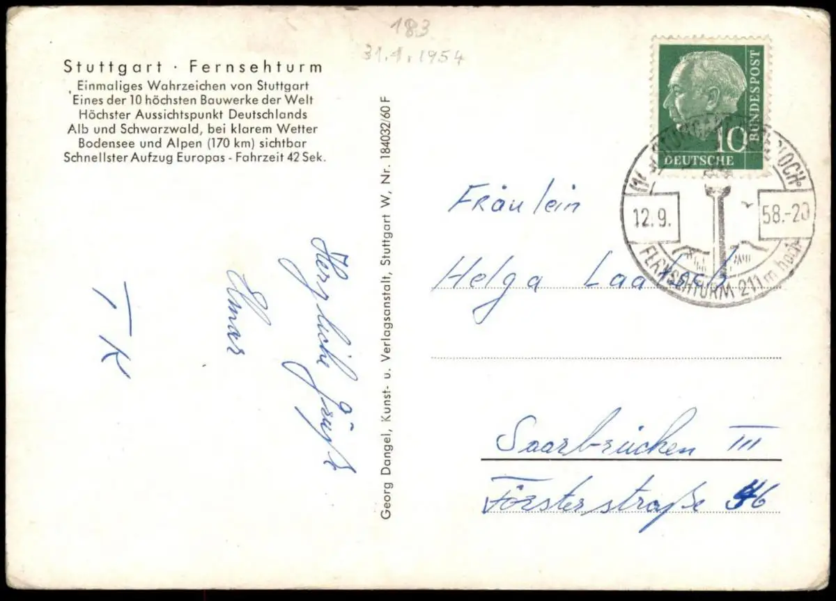 Verlag: Georg Dangel, Stuttgart Gelaufen: 12.09.1958 mit Stempel Stuttgart Degerloch nach Saarbrücken IIIErhaltung (s. Scan): mittel, unten mittig sowie Ecken etwas bestoßen, Ecke oben rechts Abrieb / 918282