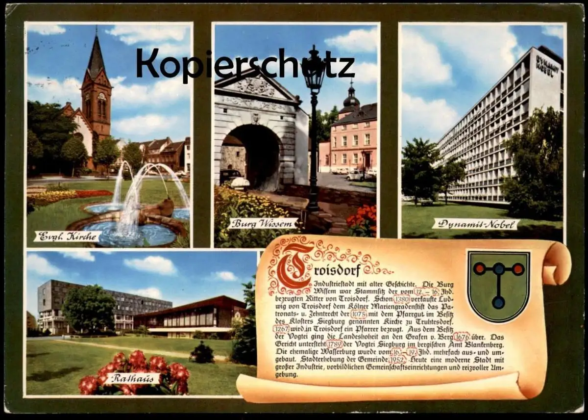 ÄLTERE CHRONIK-POSTKARTE TROISDORF BURG WISSEM DYNAMIT NOBEL EVGL. KIRCHE RATHAUSVerlag: Krapohl, Schloss Hülchrath