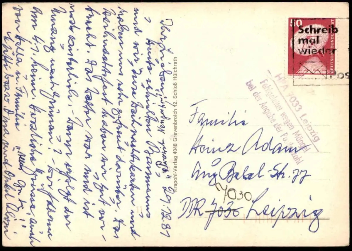 Gelaufen: 29.12.1989 nach Leipzig, Stempel: Fehlgeleitet wegen Mängel bei der Angabe der PolstleitzahlErhaltung (s. Scan): gut / 915356