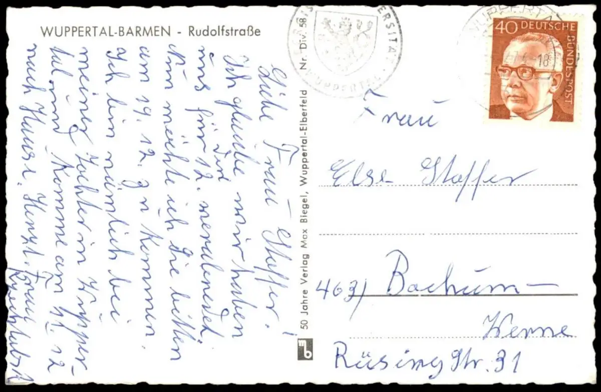 Gelaufen: 04.02.1974 mit Stempel Wuppertal nach Bochum-Werne