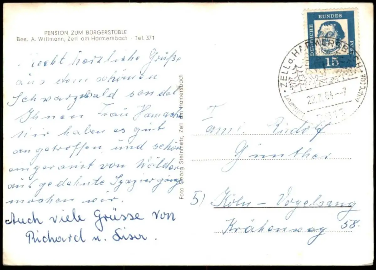 Gelaufen: 22.07.1964 mit Stempel Zell am Harmersbach nach Köln-Vogelsang