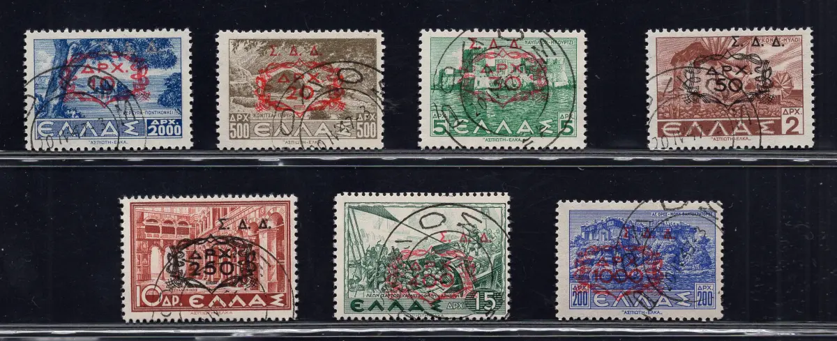 Gebraucht - Ägäische Griechische Militärverwaltung des Dodekanes - Briefmarken Griechenlands aufgedruckt Nr. 1/7 komplette Serie sieben Werte, gebraucht perfekt Cod. 2936/WEB