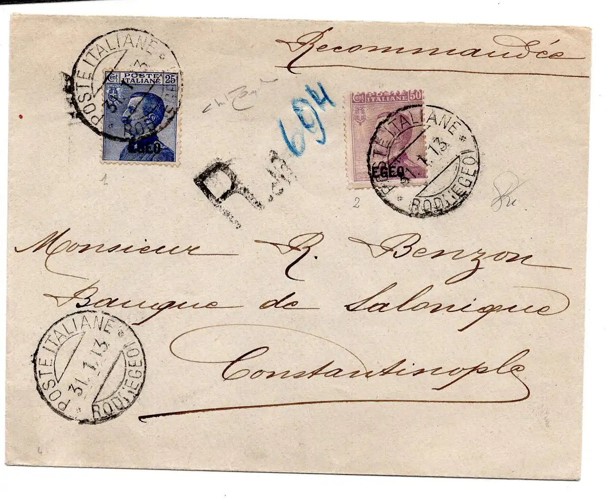 Ägäis, Michetti überdruckt Nr. 1/2 auf Einschreiben von Rhodos nach Konstantinopel am 31.1.13 mit Ankunftsstornierung - sehr guter Erhaltungszustand - Raybaudi Cod. 1229/OUTLET
