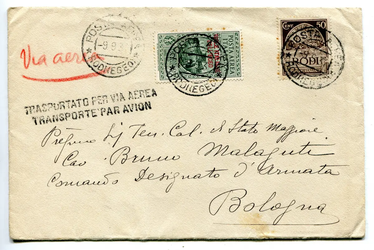 - Ägäis - Luftpost Cent. 50 Garibaldi Nr. 14 + komplementäre P.O. Nr. 61 auf Luftumschlag von Rhodos nach Bologna am 9.9.32 - neben Jahrgangsseite linear zweisprachig Luftfracht - hochwertiger nicht philatelistischer Einsatz - Kat. 400 n. 994/L
