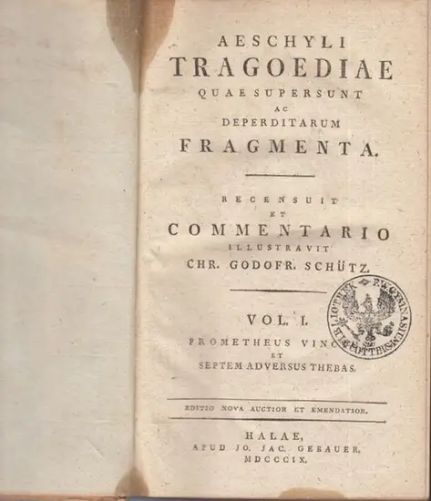 Aeschylos. - Chr. Godofr. Schütz ( recensuit et commentario illustravit ): Vol. 1: Prometheus vinctus et septem adversus Thebas. - Aeschyli Tragoediae quae supersunt ac deperditarum Fragmenta. Recensuit et commentario illustravit Chr. Godofr. Schütz.