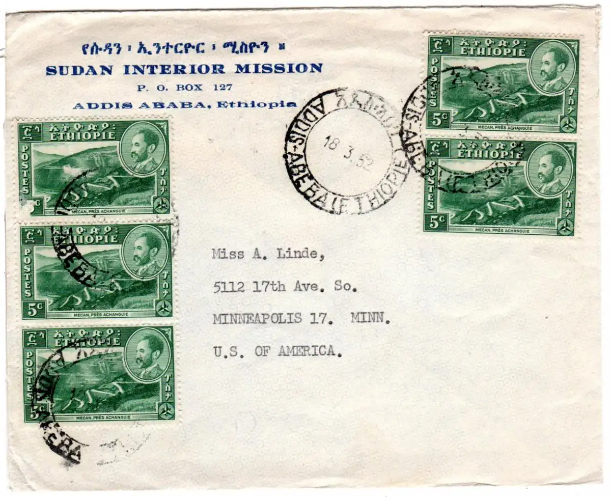 Äthiopien 1952, MeF 5x5 C. auf Sudan Int. Mission Brief v. Addis Abeba n. USA.