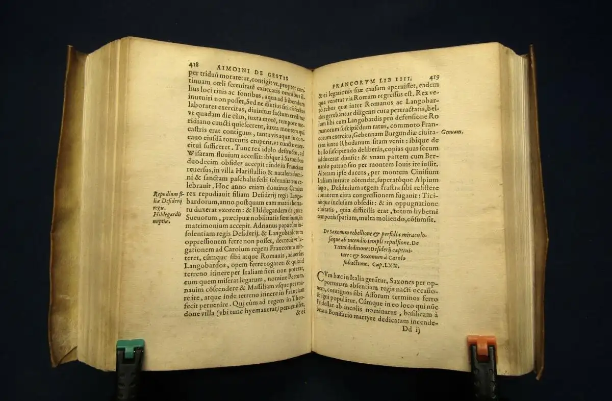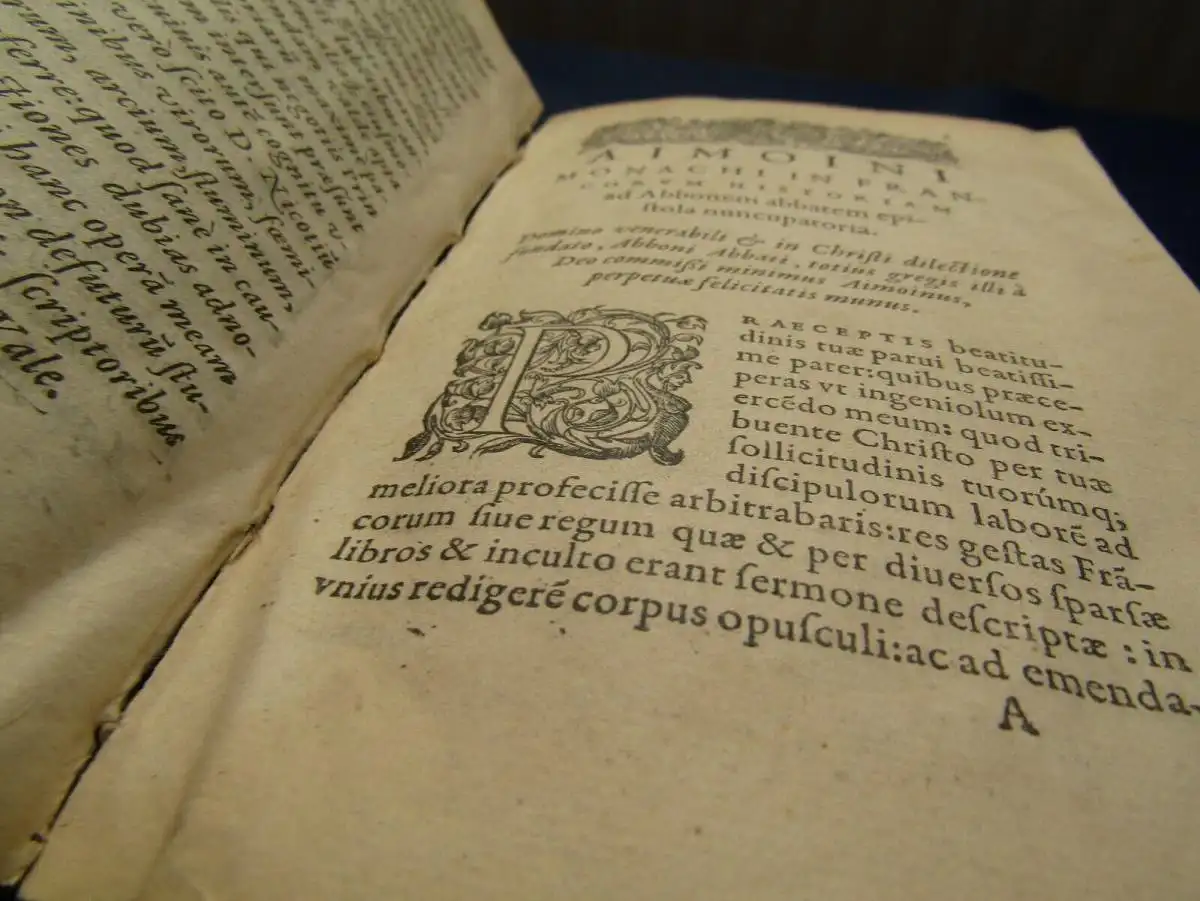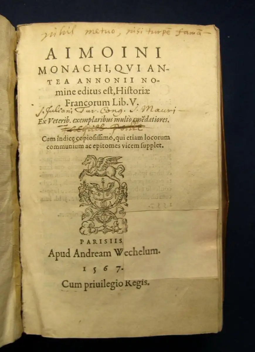 Erste Ausgabe der Fassung von Jean Nicot. Der Benediktiner Aimoin, ein Schüler von Abbon de Fleury, schloss sich um 980 den Benediktinern der Abtei Fleury an. Seine "Historiae Francorum Lib. V" bilden eine der ältesten bedeutenden Quellensammlungen in der Geschichte Frankreichs.Das Werk beinhaltet die Geschichte der Franken von den Anfängen bis 654.