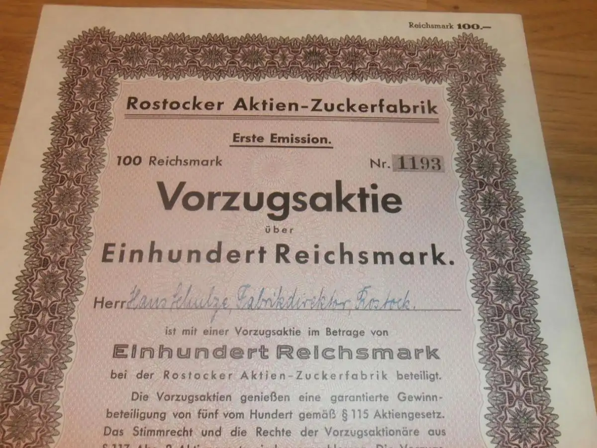 Aktie der Zuckerfabrik Rostock 1941 , Fabrikdirektor Hans Schulze , 100 RM , Mecklenburg !!