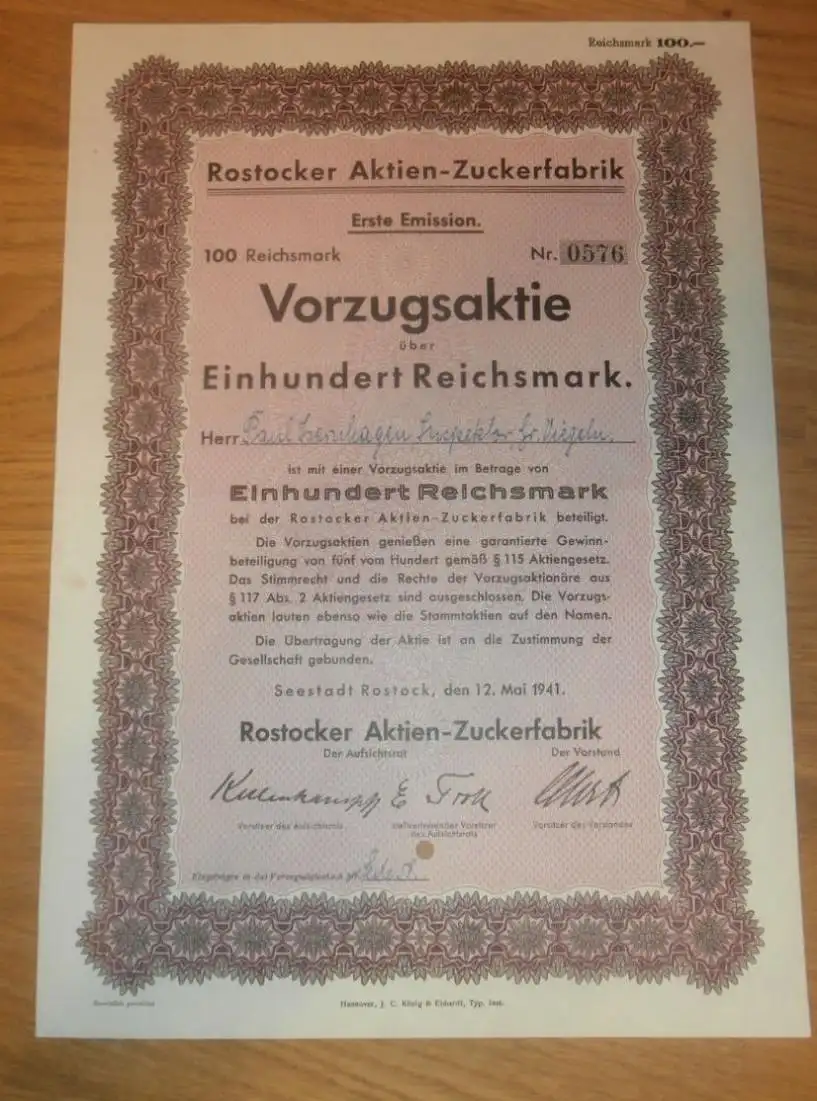 Aktie der Zuckerfabrik Rostock 1941 , Paul Isernhagen in Groß Viegeln , 100 RM , Mecklenburg !!
