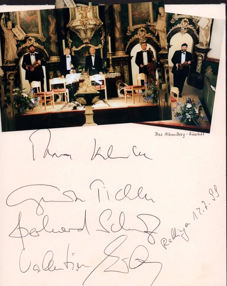 Alban Berg Quartett. Zwei Farbfotos sowie Autogramme der vier Musiker