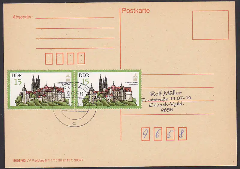 Albrechtsburg Meissen, 15 Pfg. Karte (2870), portogenau OSt. Erlbach 1.7.90 mit neuer Gebühr durch Währungsunion