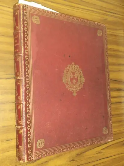In folio Demi-veau rouge, le dos à cinq nerfs, richement doré avec des cachets de la couronne et des lys des Bourbons. Quelques armoiries sur les deux plats et le dos, les tranches dorées, les pages de garde marbrées en rouge. VIII,202 pp., imprimées en bleu et noir. Avec 33 pl. page-double hors-texte. Pour quelques pl. manque le papier de soie. La reliure peu tachetée, les coins un peu usés, la jointure dans l‘intérieur d’avant un peu endommagée, mais reparée. Le texte en trois chapitres: 1) Les Francais en Alsace avant la reddition de Strasbourg (1552-1681). - 2) De la capitulation de Str. a la Revolution franc. (1673-1789). 3) L'Alsace sous la Restauration (depuis la Revolution). Edition de luxe. Les pl. avec réproduction des gravures de J.M. Weis : Representation des fetes donnes par la Ville de Strasbourg pour la convalescence du Roi et le texte, aussi gravé sous le titre: Description des fetes ..., 1681. --- Folio. VIII, 202 S.., 1 Bl. Blau u. schwarz gedruckt. Mit 33 meist doppelblattgr. Tafeln. Roter Originalhalblederband auf 5 Bünden, mit reicher Vergold., vor allem bestehend aus mehrfachen Stempeln mit Krone u. Lilie der Bourbonen, auch einige Wappenembleme auf beiden Deckeln u. Rücken, hier Rtitel; ebenfalls die Bünde sowie allseitig der Schnitt vergoldet; hauptsächlich rot gemusterte Buntpapiervorsätze; min. fleckig u. etwas berieben, die Deckelecken leicht abgenutzt, das Leder an den Außengelenken berieben, vorderes Innengelenk war geplatzt und wurde fast unsichtbar stabilisiert. - Ein paar Tafeln fehlen die Seidenpapier-Deckblätter, unbedeutende Klebreste vorhanden. Innen- und Gesamtzustand insgesamt gut