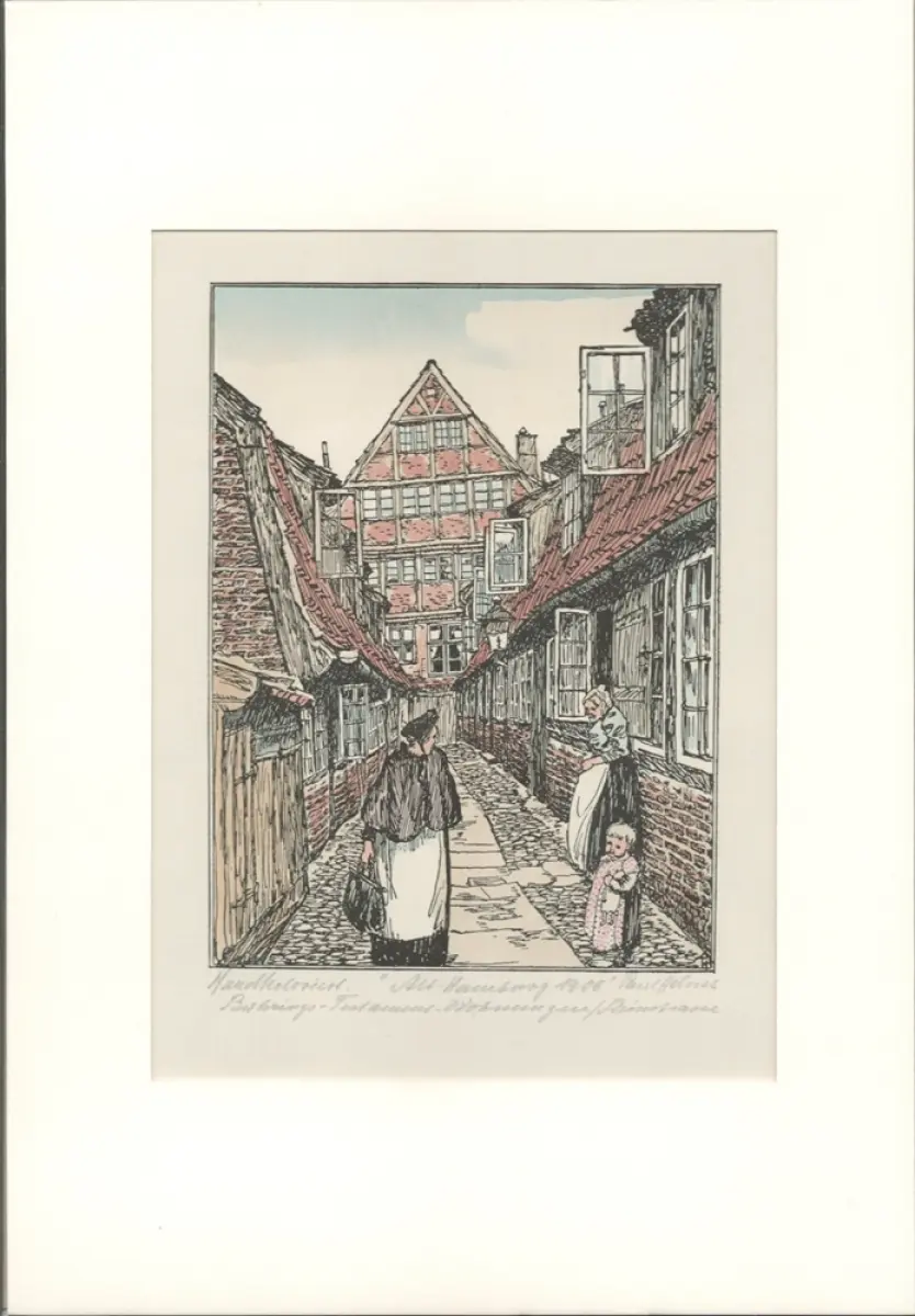 Blick in den Hof mit den 1535 von Anna Büring gestifteten "Gotteswohnungen" in der Steinstraße, Hamburger Altstadt. Im Vordergrund eine Frau mit Arzttasche, blickend auf eine ältere Dame und Kleinkind rechts. - Paul Helms (1884-1961), hatte nach einer Lithographenlehre u.a. bei C. O. Czeschka studiert. Ab 1908 lehrte er an der Kunstgewerbeschule am Lerchenfeld in Hamburg. Die Großstadt Hamburg, ihr Hafen und ihre Menschen wurden seine bevorzugten Sujets. Ab Mitte der 1950er Jahre wandte sich Helms von den graphischen Techniken der Ölmalerei zu (vor allem Landschaftsmalerei und Nord- und Ostseemotive)