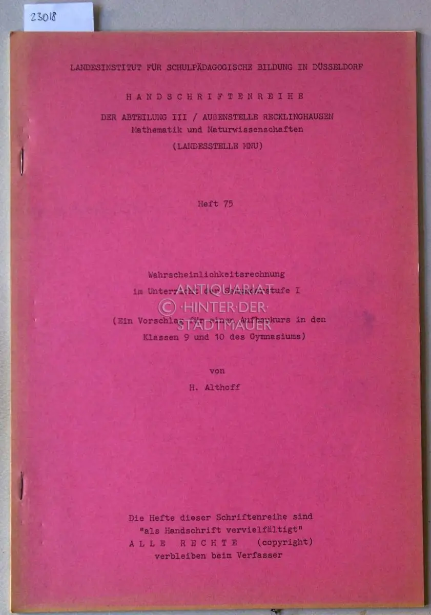 Althoff, Heinz: Wahrscheinlichkeitsrechnung im Unterricht der Sekundarstufe I. (Ein Vorschlag für einen Aufbaukurs in den Klassen 9 und 10 des Gymnasiums.) [= Handschriftenreihe der Landesstelle MNU, Heft 75].