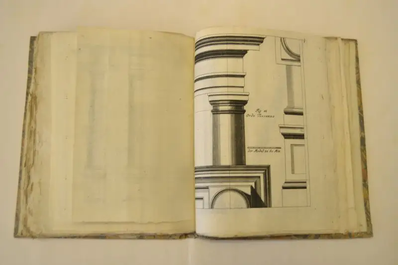 Erste Ausgabe. - Christian Freiherr von Wolff (1679-1754) war Mathematiker und Philosoph und verfasste u.a. "Der Anfangsgründe aller Mathematischen Wissenschaften ...", erschienen 1732. - Die Tafeln zeigen überwiegend Säulen, das Frontispiz zeigt den zu einer Frau herabfliegenden Gott Merkur mit Flügeln an Kopf und Füßen und den von zwei Schlangen umkreisten magischen Stab, mit Augsburg im Hintergrund, ausgeführt von Georg Christian Kilian. - Kanten etwas berieben, Vorderdeckel mit kl. Schabspur, Rücken etwas beschabt und mit wenigen stärkeren winzigen Abreibungen, oberes Kapital mit kl. Fehlstelle, Frontispiz verso mit kl. braunen Fleck im Rand, Tafeln 7-31 mit blassem Feuchtigkeitsrand im oberen Rand zum Falz hin, sonst gutes sauberes Exemplar mit den schönen gestochenen Tafeln.
