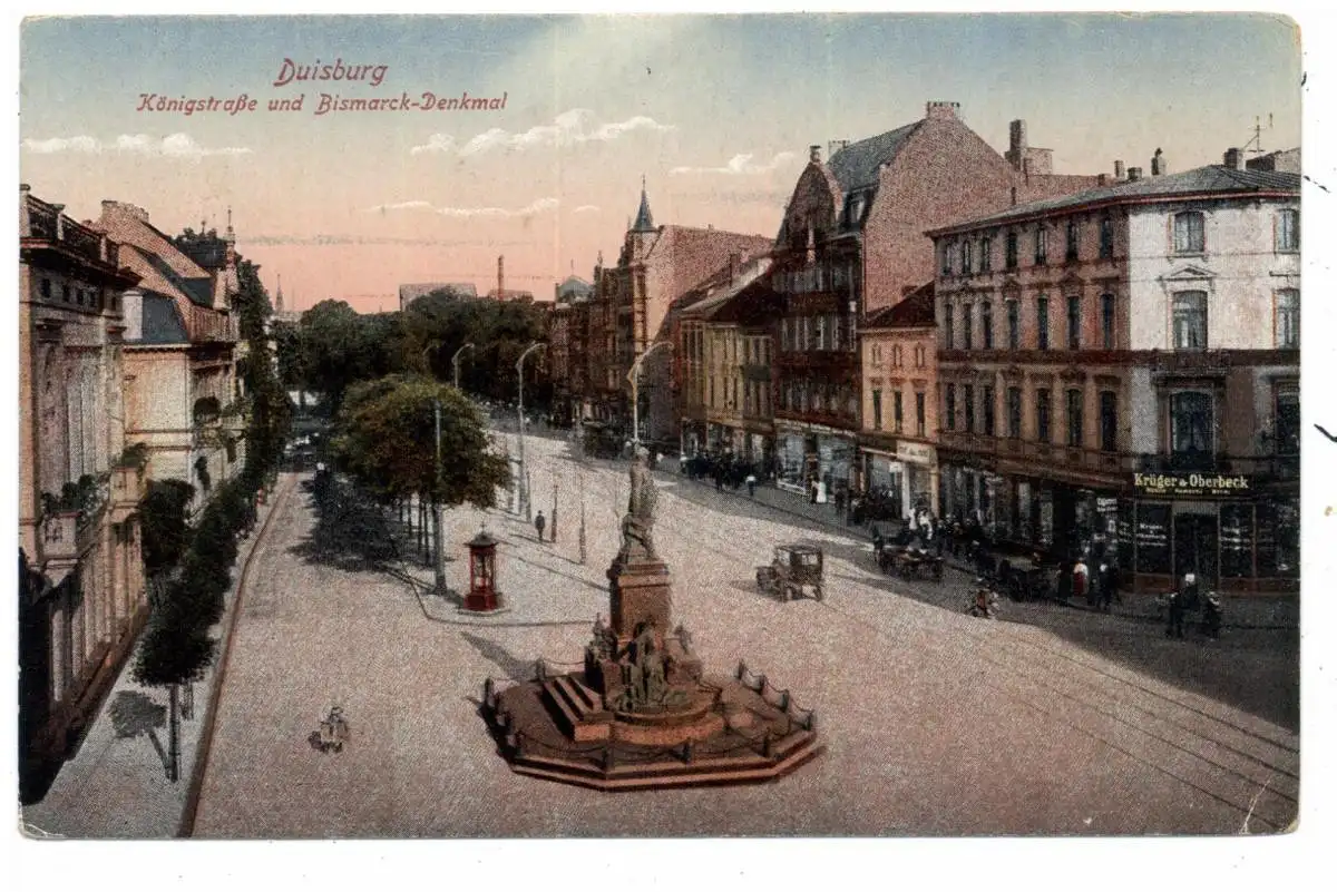 [Ansichtskarte] 4100 DUISBURG, Königstrasse, Bismarckdenkmal, Fa. Krüger & Oberbeck, Verlag Trinks - Leipzig.
