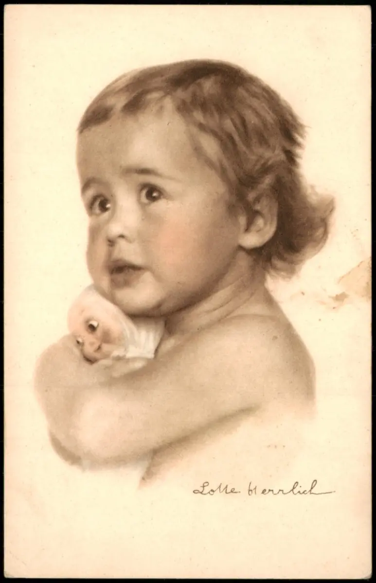 Name: Lotte Herrlich Kinderköpfe, Kind hält Puppe lieb
