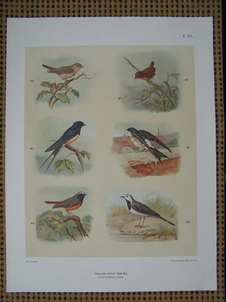 Kontraststarke und farblich prächtige Vögel (Gartengrasmücke, Rauchschwalbe, Gartenrotschwanz, Zaunkönig, Segler) gezeichnet für den Naturgeschichtlichten Anschauungsunterricht (Format: 68 x 84cm). Die Tafel bildet die 40te Schulwandtafel der Tiere von "Hartinger's Wandtafeln", in der eine Reihe von botanischen und zoologischen Objekten zumeist aus 8 oder 10 farbigen Chromolithographien gefertigt wurden. Während bei den älteren Tafeln die Farben rein deckend oder mit Spritzmanier in Farbmischung erschienen, sind bei den unter dem Einfluss des Jugendstils entstandenen Tafeln verschiedene Tangiermanieren angewendet worden, die den Farbflächen unterschiedliche Punkt- oder Strichraster verleihen. Nur wenige Tafeln wurden in farbiger Autotypie gedruckt.