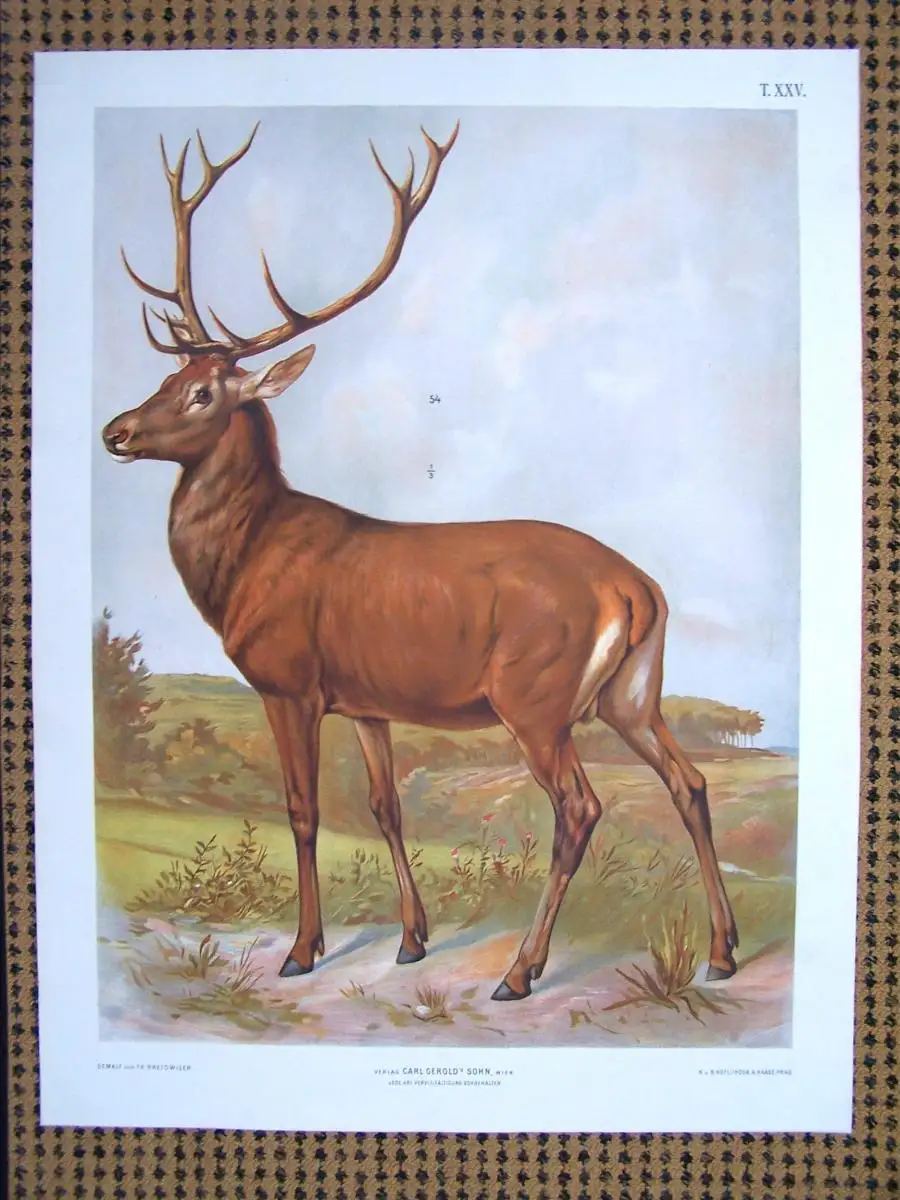 Kontraststarke und farblich prächtiges Wild (Hirsch) in Waldlandschaft gezeichnet für den Naturgeschichtlichten Anschauungsunterricht (Format: 68 x 84cm). Die Tafel bildet die 25te Schulwandtafel der Tiere von "Hartinger's Wandtafeln", in der eine Reihe von botanischen und zoologischen Objekten zumeist aus 8 oder 10 farbigen Chromolithographien gefertigt wurden. Während bei den älteren Tafeln die Farben rein deckend oder mit Spritzmanier in Farbmischung erschienen, sind bei den unter dem Einfluss des Jugendstils entstandenen Tafeln verschiedene Tangiermanieren angewendet worden, die den Farbflächen unterschiedliche Punkt- oder Strichraster verleihen. Nur wenige Tafeln wurden in farbiger Autotypie gedruckt.