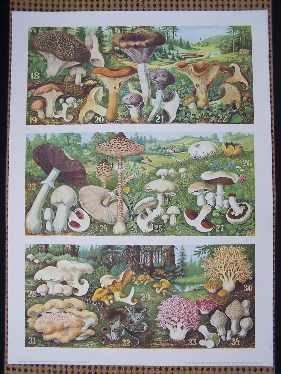 Hartinger's Wandtafeln (1880-1925): Tiere T. Vb., verschiedene Speisepilze (u.a. Champignon, Pfifferling, Parasolpilz) (vmtl um 1925)