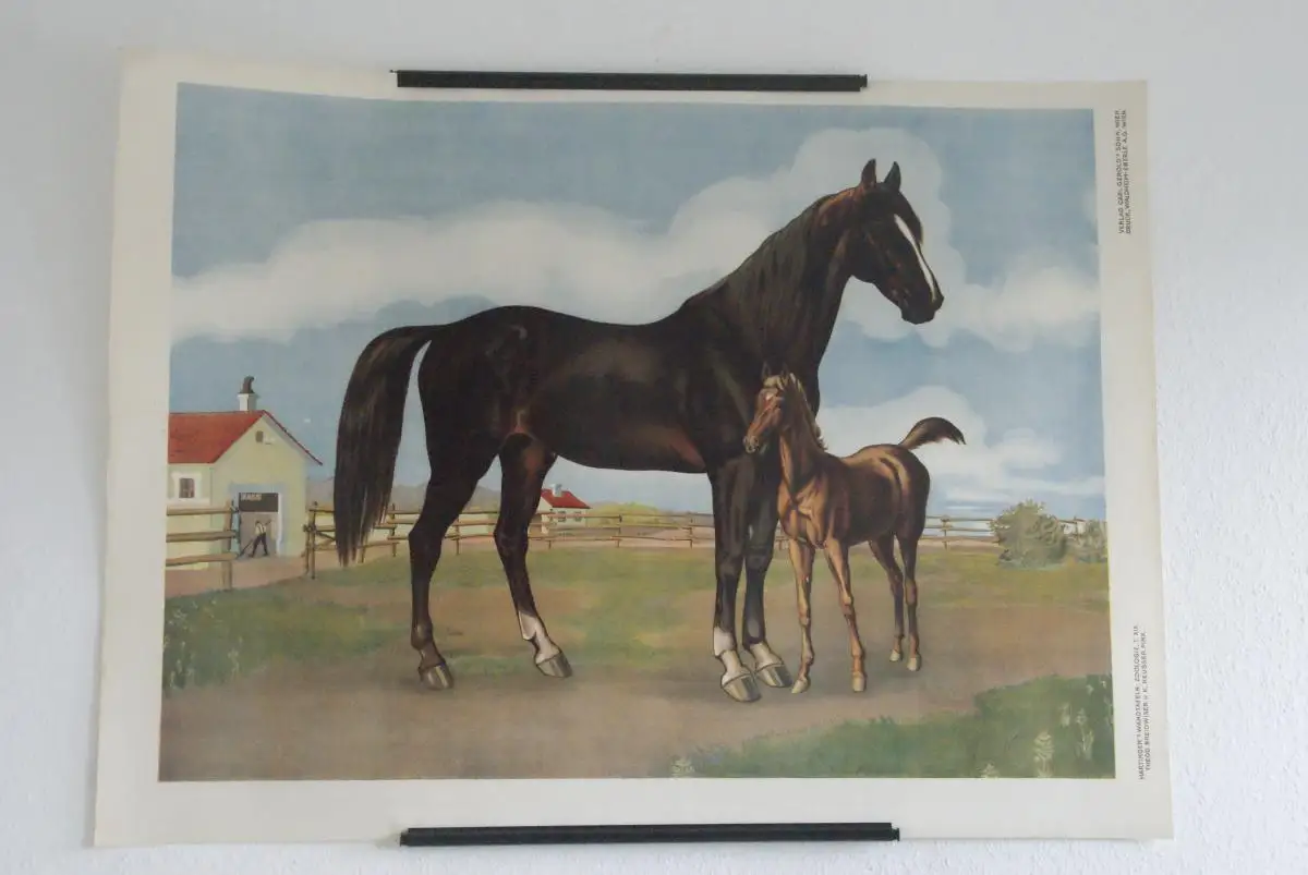 Kontraststarke und farblich prächtiges Pferd mit weißer Kopflinie und Pfohlen in Stallnähe gezeichnet für den Naturgeschichtlichten Anschauungsunterricht (Format: 98 x 72cm). Die Tafel bildet die 19te Schulwandtafel der Tiere von "Hartinger's Wandtafeln", in der eine Reihe von botanischen und zoologischen Objekten zumeist aus 8 oder 10 farbigen Chromolithographien gefertigt wurden. Während bei den älteren Tafeln die Farben rein deckend oder mit Spritzmanier in Farbmischung erschienen, sind bei den unter dem Einfluss des Jugendstils entstandenen Tafeln verschiedene Tangiermanieren angewendet worden, die den Farbflächen unterschiedliche Punkt- oder Strichraster verleihen. Nur wenige Tafeln wurden in farbiger Autotypie gedruckt.