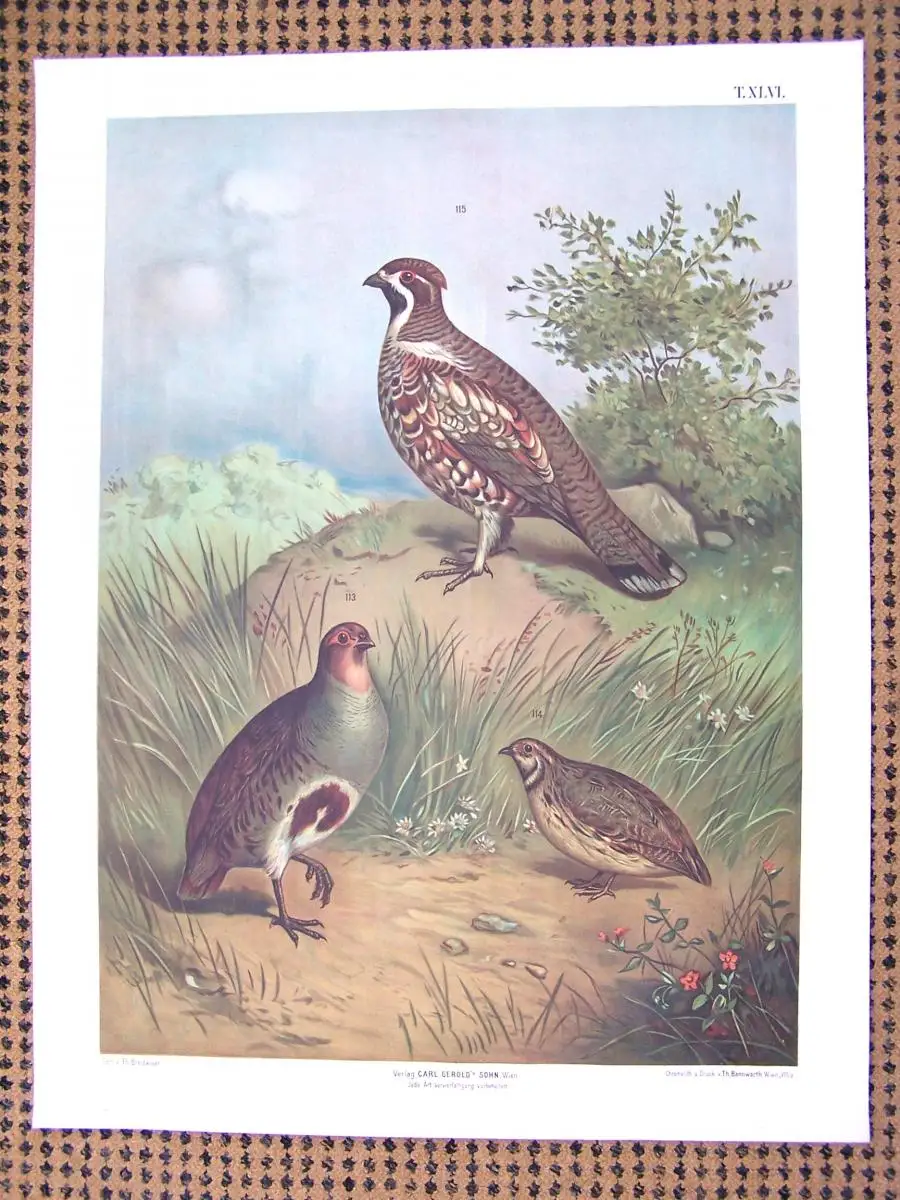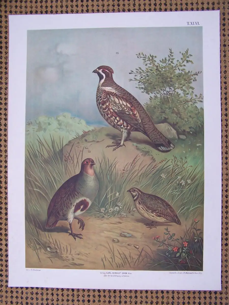 Kontraststarke und farblich prächtiger Vögel (Rebhuhn, Wachtel, Haselhuhn) gezeichnet für den Naturgeschichtlichten Anschauungsunterricht (Format: 84 x 68cm). Die Tafel bildet die 46te Schulwandtafel der Tiere von "Hartinger's Wandtafeln", in der eine Reihe von botanischen und zoologischen Objekten zumeist aus 8 oder 10 farbigen Chromolithographien gefertigt wurden. Während bei den älteren Tafeln die Farben rein deckend oder mit Spritzmanier in Farbmischung erschienen, sind bei den unter dem Einfluss des Jugendstils entstandenen Tafeln verschiedene Tangiermanieren angewendet worden, die den Farbflächen unterschiedliche Punkt- oder Strichraster verleihen. Nur wenige Tafeln wurden in farbiger Autotypie gedruckt.