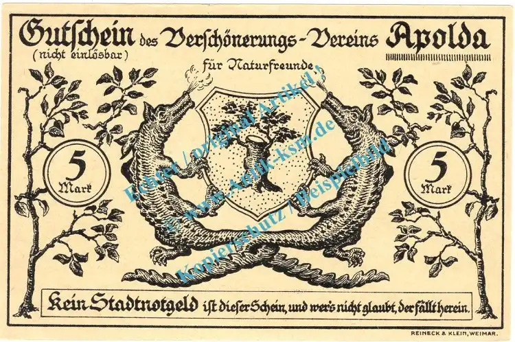 Apolda , Notgeld 5 Mark Schein -B- in kfr. M-G 37.1 , Thüringen o.D. Seriennotgeld