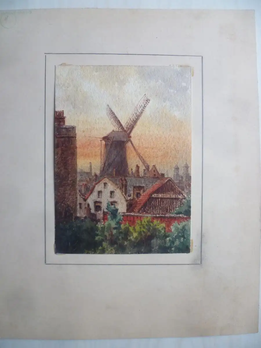 Aquarell Windmühle mit Stadt in Niederlande oder Norddeutschland, unsigniert