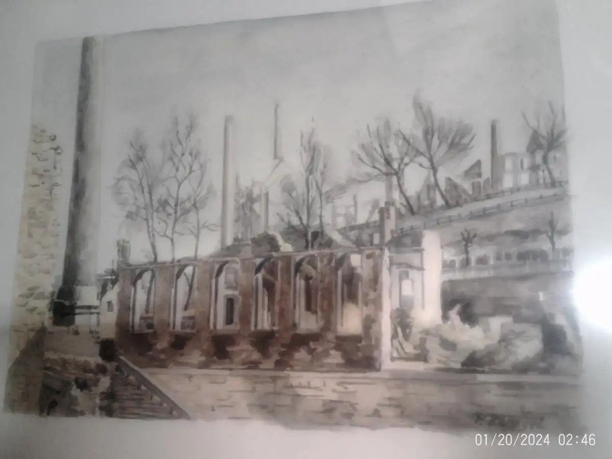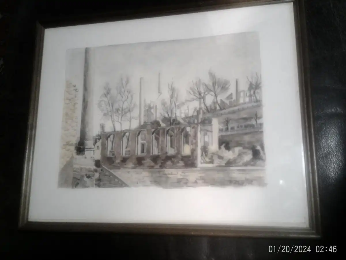 Die Zeichnung fängt die Atmosphäre des industriellen Verfalls ein, ein beliebtes Motiv für Künstler, die sich mit der Industriegeschichte Deutschlands, insbesondere in Regionen wie dem Ruhrgebiet oder Ostdeutschland, auseinandersetzen. Das Bild zeigt die verfallenen Bögen eines Gebäudes mit Schornsteinen im Hintergrund und kahlen Bäumen auf den Überresten der Anlage.