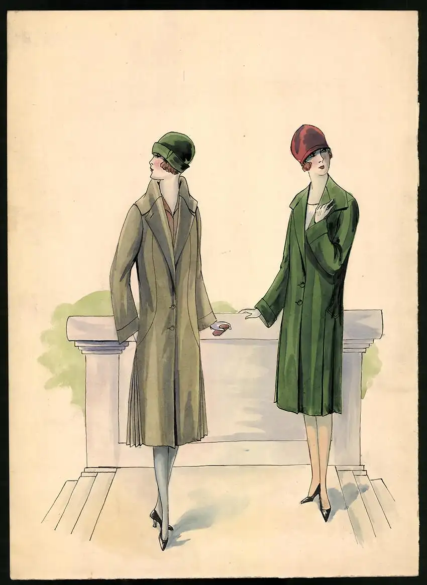 Aquarellmalerei Mode, Damen präsentieren die aktuelle Modekollektion Herbstmäntel samt Mütze, 24 x 33cm