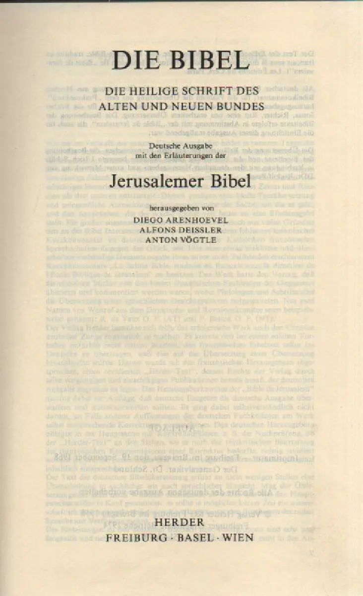 Titel: Die Bibel. Die heilige Schrift d. Alten u. Neuen Bundes ; deutsche Ausg. mit d. Erl. d. Jerusalemer Bibel. (hrsg. von Diego Arenhoevel ; Alfons Deissler [u.a.] Die Übers. d. Erl. aus d. Franz., d. Bearb. d. Bibeltexte u. d. Einrichtung d. Ausg.: Ulrich Schütz in Verb. mit d. deutschen Hrsg. u. unter Mitw. von Rudolf Pesch)